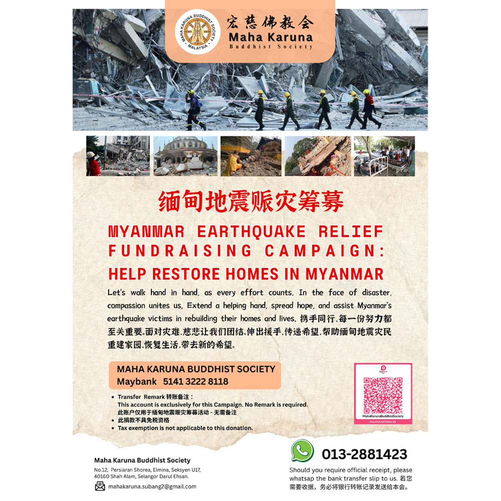 In this challenging time, the Maha Karuna Buddhist Society has initiated the “Myanmar Earthquake Relief Fundraising Campaign.” We sincerely call upon friends from all walks of life join us to extend a helping hand and offer selfless compassion to assist the disaster-stricken people of Myanmar. Regardless of the contribution amount, every act of kindness will bring hope and strength to the victims, providing them with warmth and hope.